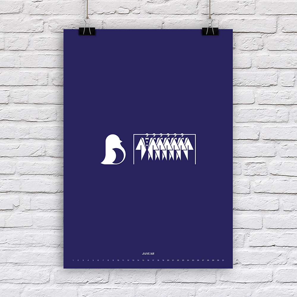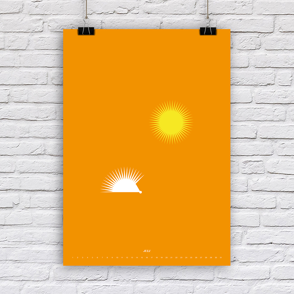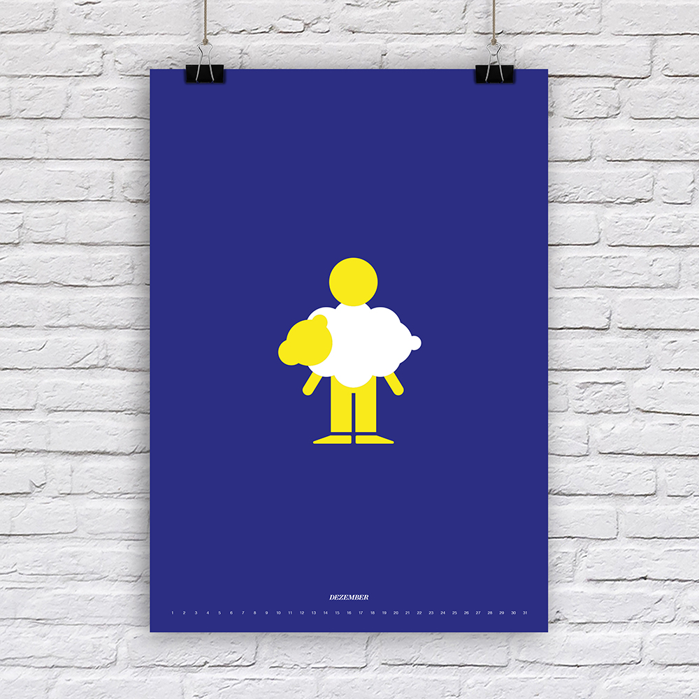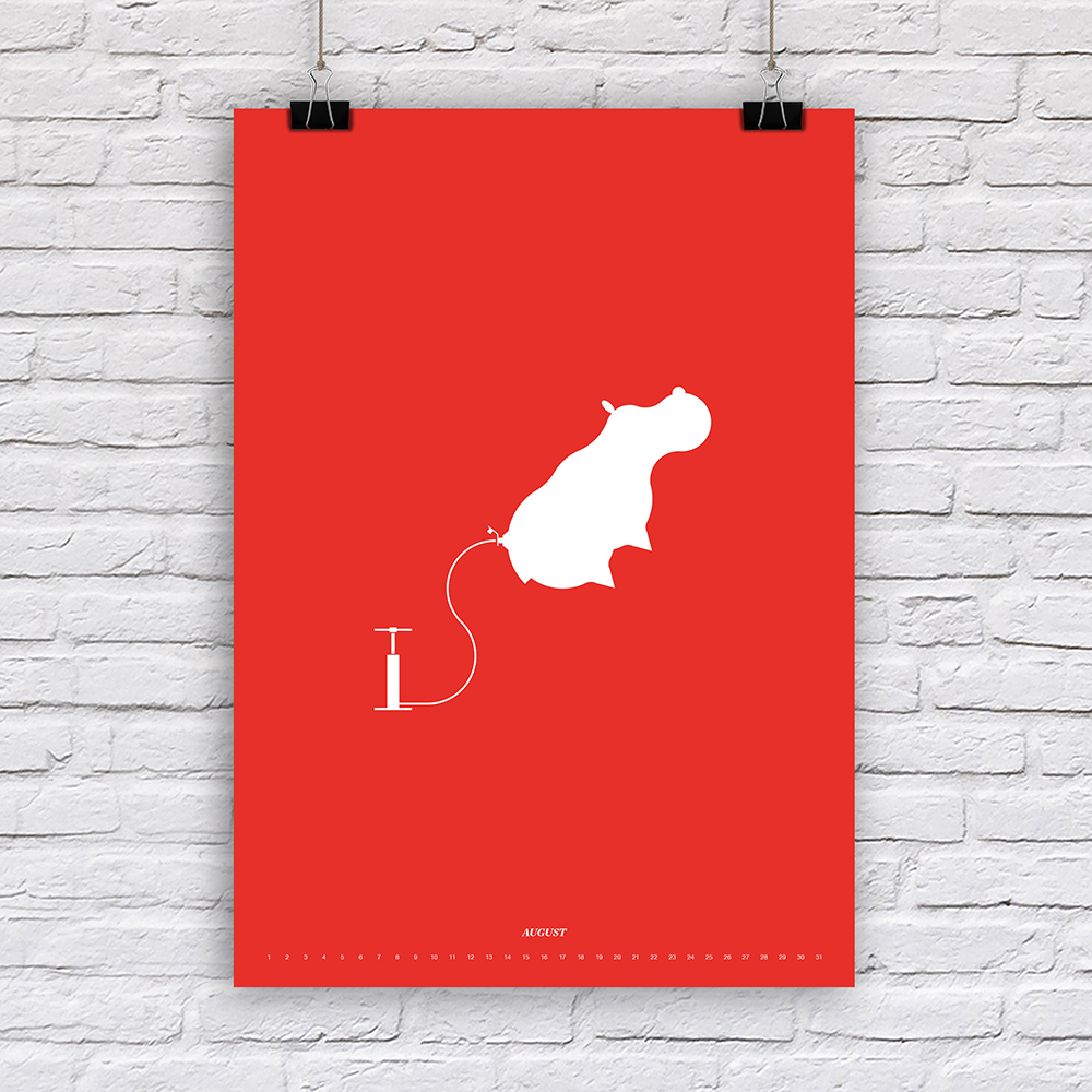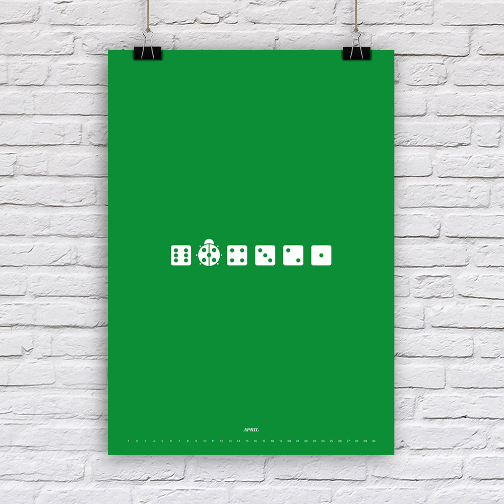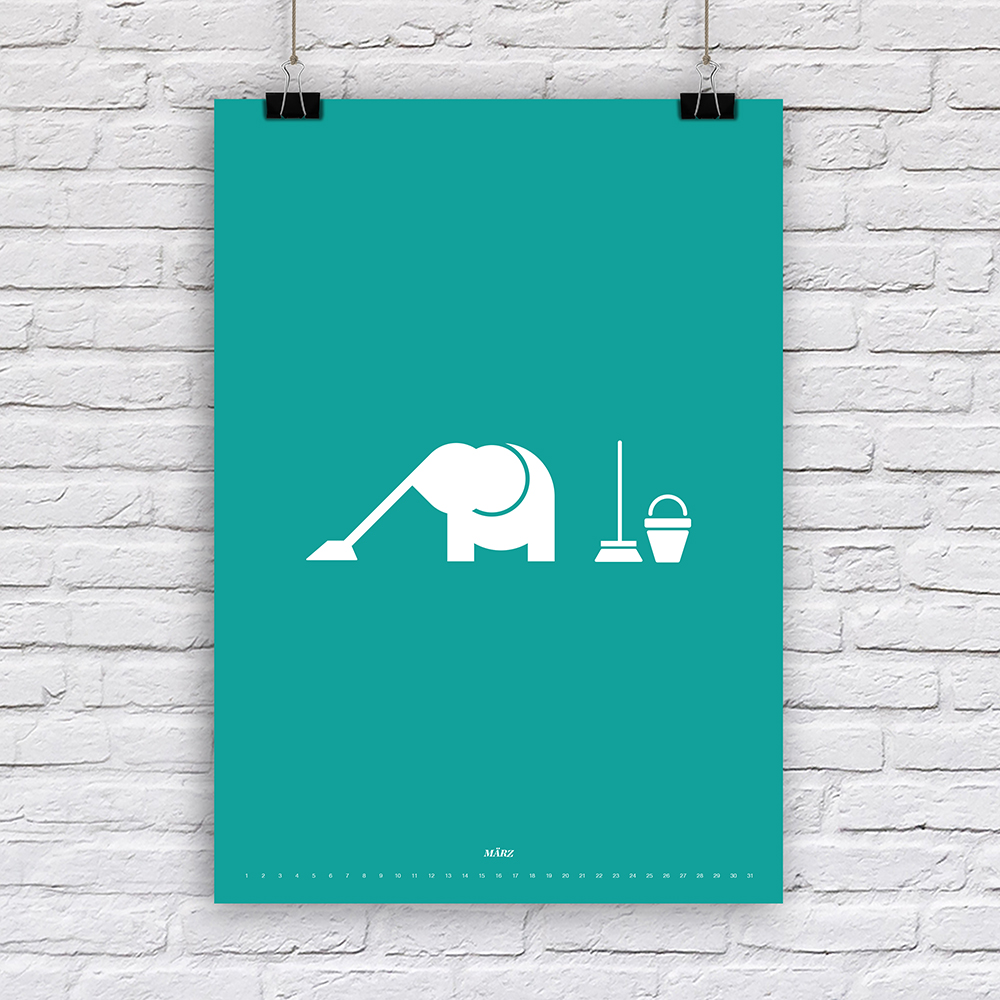 Der Designer Fabian Reber gestaltet auf eigenständige und kreative Art und Weise Kalender neu. Mit minimalistischer Form- und Farbgestaltung erzählt er kleine humoristische Geschichten, passend zum Monat. Die Monatsbilder sind nicht an ein bestimmtes Jahr gebunden, da die Tagesbezeichnungen weggelassen wurden
