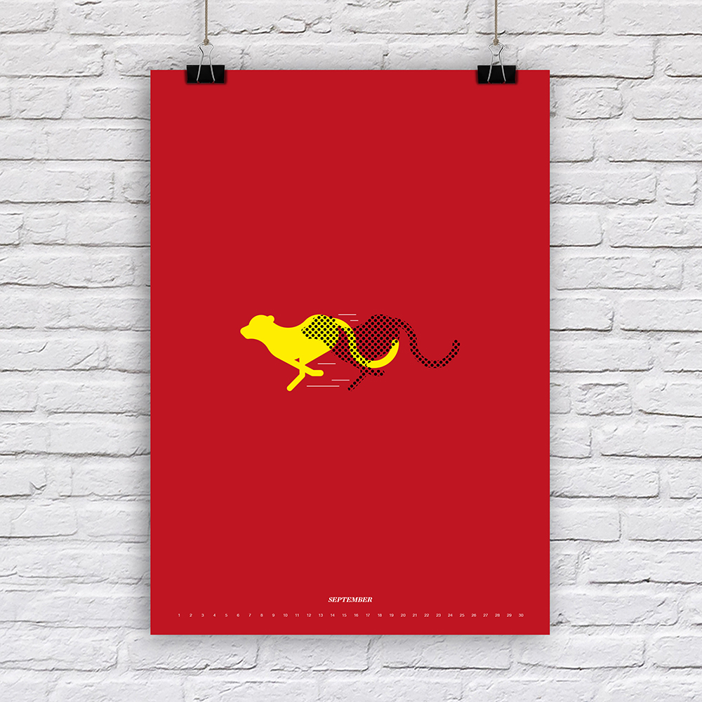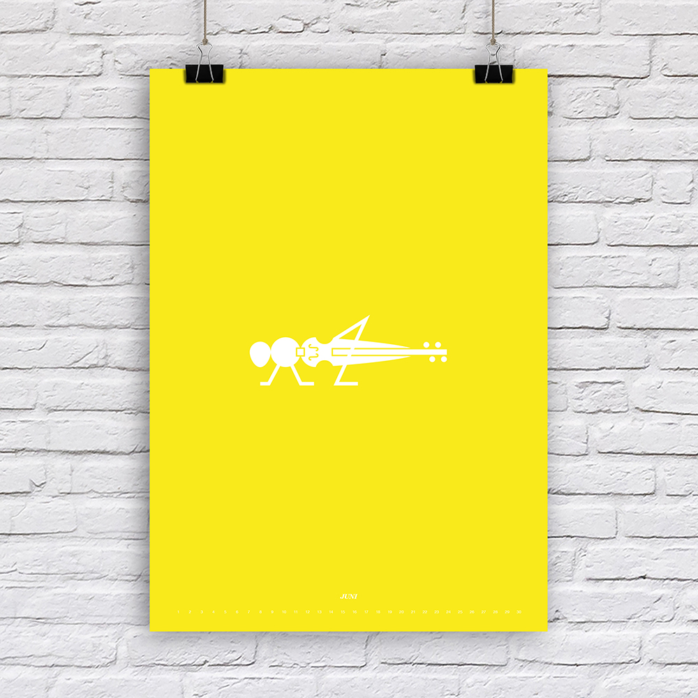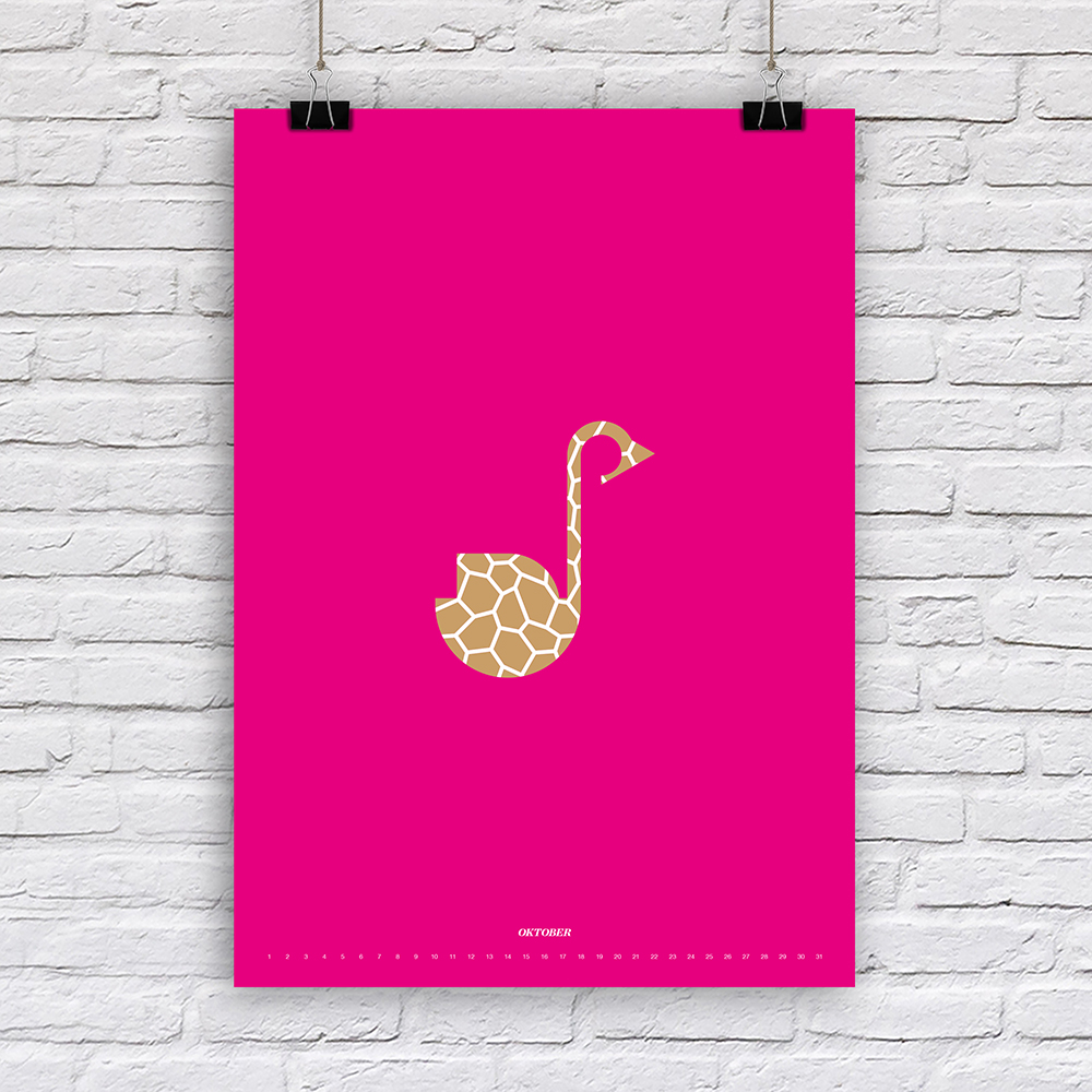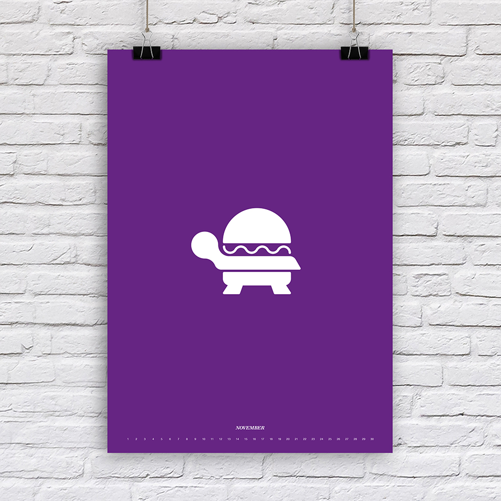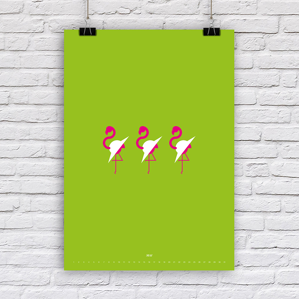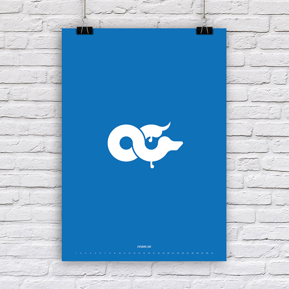 Der Designer Fabian Reber gestaltet auf eigenständige und kreative Art und Weise Kalender neu. Mit minimalistischer Form- und Farbgestaltung erzählt er kleine humoristische Geschichten, passend zum Monat. Die Monatsbilder sind nicht an ein bestimmtes Jahr gebunden, da die Tagesbezeichnungen weggelassen wurden
